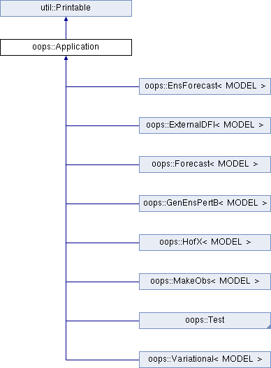As such, the execution of the JEDI code is achieved by means of an Application object class that is defined in the oops namespace. As illustrated in the following class hierarchy, oops::Test is a sub-class of the oops::Application class, along with other applications such as individual or ensemble forecasts: